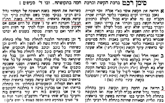Our Rabbis taught:2 He who sees the sun at its turning point,3 the moon in its power,4 the planets in their orbits,5 and the signs of the zodiac in their orderly progress,6 should say: Blessed be He who has wrought the work of creation. And when [does this happen]?7 — Abaye said: Every twenty-eight years when the cycle8 begins again and the Nisan [Spring] equinox falls in Saturn on the evening of Tuesday,9 going into Wednesday.but Rashi explains Abaye {citing from a footnote in Soncino}: