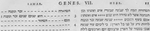Thus, they change ish veIshto to male and female. This might just be an artefact of the translation process. But they also specify the word "pairs" by the unclear cattle. And they specify "clean" flying creatures. They add one extra element over the Samaritan text. The Samaritan text, with its clarification, still left the Biblical text with a disparity in the bird pasuk, in that seven clean were mentioned while two unclean were not mentioned. The Septuagint text "corrects" this problem.Because of all of this, my strong inclination is that the Septuagint text was based on a Hebrew original similar or identical to the text in the Samaritan Torah. Yet this Samaritan text was not original, but was a typical emendation of the Masoretic text by the Samaritan scribe. And still, the instances of Onkelos et al. rendering ish veIshto as male and female is just good translating, rather than a reflection of this alternate girsa.